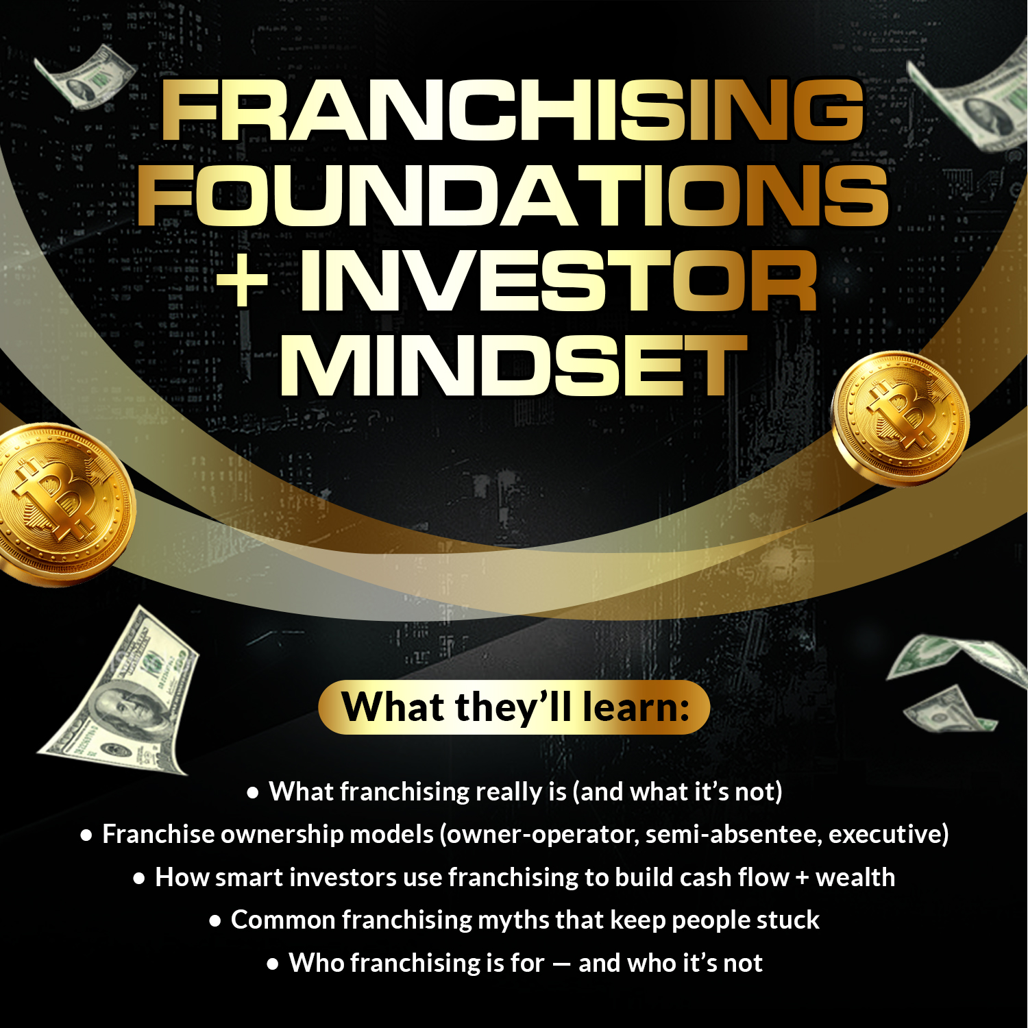 The Financial Freedom Live Mentorship is a live franchising education experience designed to teach you how to understand franchising, identify the right franchise opportunities, secure funding, and build a scalable, cash-flowing business. Whether you’re brand new to franchising or looking to expand your existing business portfolio, this mentorship provides a clear, step-by-step framework to help you make confident, informed franchise decisions.